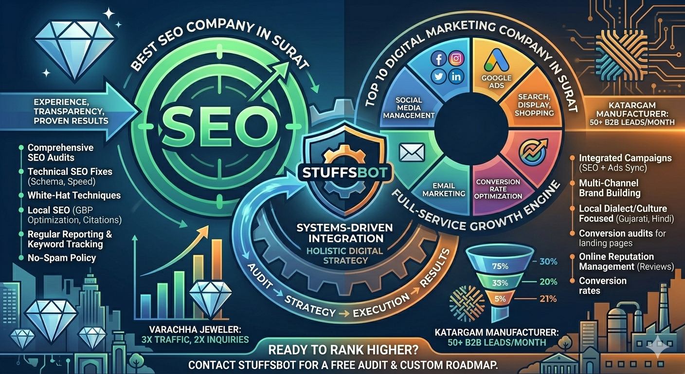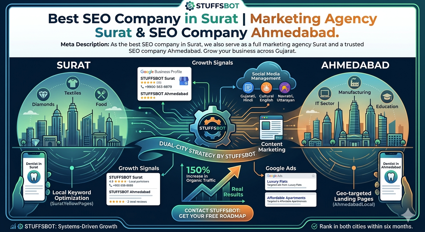 As the best SEO company in Surat, we also serve as a full marketing agency Surat and a trusted SEO company Ahmedabad. Grow your business across Gujarat.